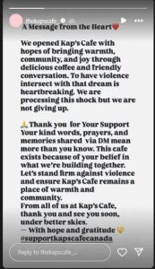 कैप्स कैफे (Kap’s Cafe) की तरफ से इंस्टा स्टोरी पर लिखा गया है कि हमने इस कैफे को अपनी कम्यूनिटी के बीच इस उम्मीद से खोला था कि वो शानदार कॉफी के साथ खुशी से गपशप कर सकेंगे। हमारे इस सपने पर हिंसा का प्रहार दिल तोड़ने वाला है। इस सदमे से उभरने की कोशिश कर रहे हैं।